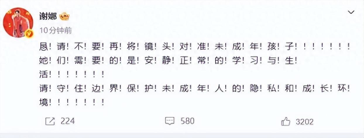 2月25日,#谢娜带双胞胎女儿上课#登上热搜引关注,据悉有八卦媒体拍到谢娜带双胞胎女儿上课。25日午间,谢娜发文呼吁恳请不要再将镜头对准未成年孩子,“请守住边界保护未成年人的隐私和成长环境”,并连发68个感叹号。