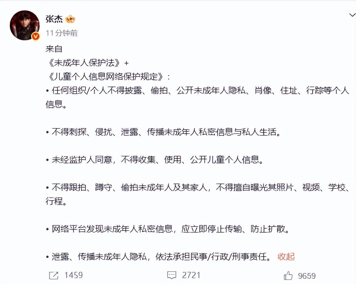 随后张杰发布《未成年人保护法》和《儿童个人信息网络保护规定》相关内容,其中提到“不得跟拍、蹲守、偷拍未成年人及其家人,不得擅自曝光其照片、视频、学校、行程”等。